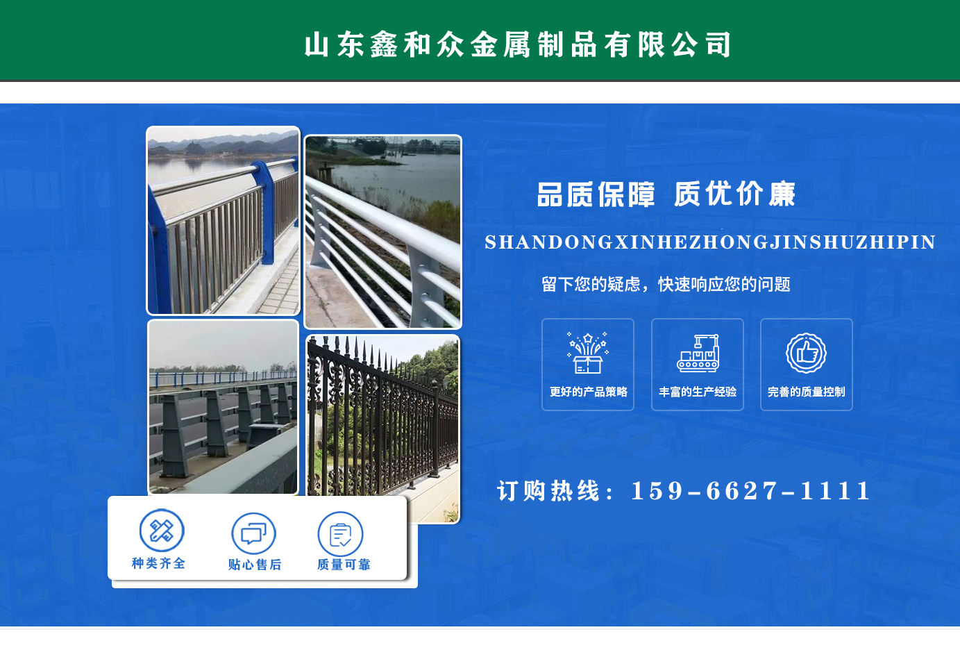 山東鑫和眾金屬制品有限公司主要產(chǎn)品有防撞護(hù)欄,橋梁護(hù)欄,道路護(hù)欄,河道護(hù)欄,不銹鋼護(hù)欄等護(hù)欄。提供設(shè)計(jì)方案,一站式定制,包您滿意價(jià)格優(yōu)惠,歡迎來電咨詢!    公司常年從事銷售護(hù)欄防撞護(hù)欄,橋梁護(hù)欄,道路護(hù)欄,河道護(hù)欄,不銹鋼護(hù)欄,橋梁鋼護(hù)欄,河道燈光護(hù)欄等。產(chǎn)品廣泛應(yīng)用于橋梁、河道、旅游景區(qū)、道路、公路、公園、小區(qū)、景觀、道路防撞等領(lǐng)域。    公司產(chǎn)品均采用優(yōu)質(zhì)不銹鋼材料,符合相關(guān)標(biāo)準(zhǔn)。各種型號(hào)不銹鋼復(fù)合管及護(hù)欄,質(zhì)量嚴(yán)格把控。產(chǎn)品強(qiáng)度高、耐腐蝕、焊接牢固、抗沖擊、性能好,防撞護(hù)欄結(jié)構(gòu)簡單、美觀實(shí)用大方。     歡迎前來訂購!...